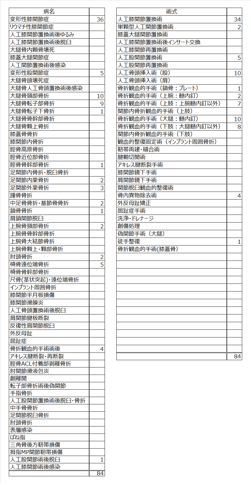 2026年1月~12月(整形外科手術症例別件数表1月更新)