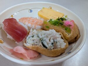 まぐろ・エビ・卵の握りと変わり稲荷2種の提供です。