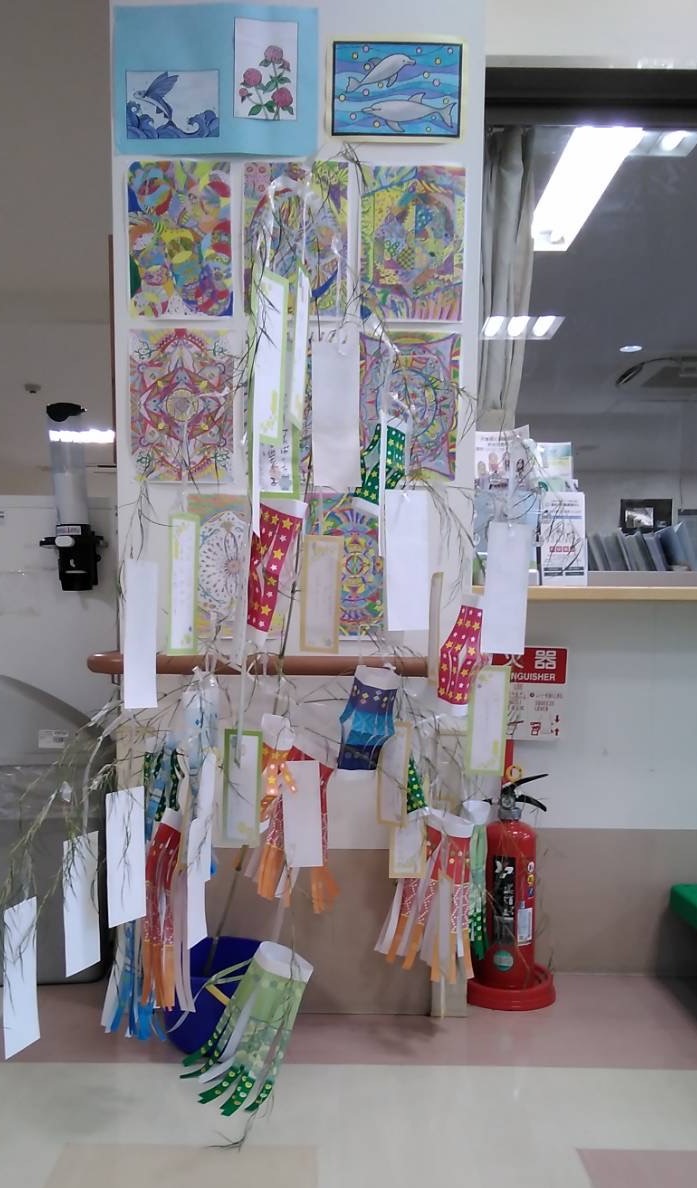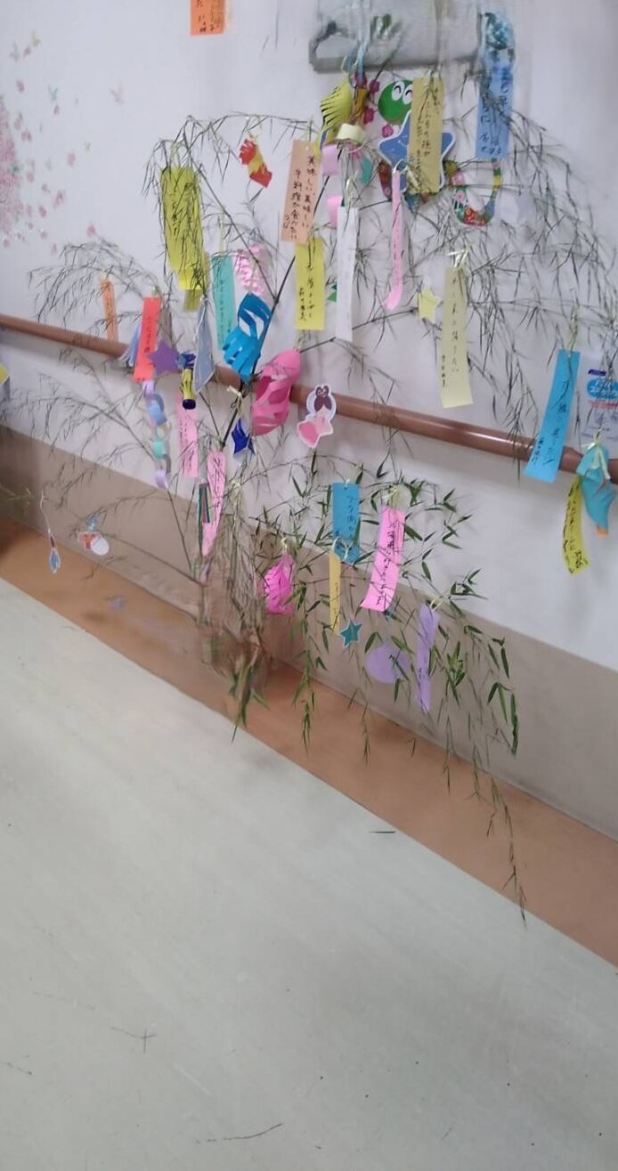 持ち帰った笹は、2階フロアー・3階フロアー・デイフロアーの利用者様に提灯や投網や輪飾りなど装飾の作成や願い事を書いていただきました。