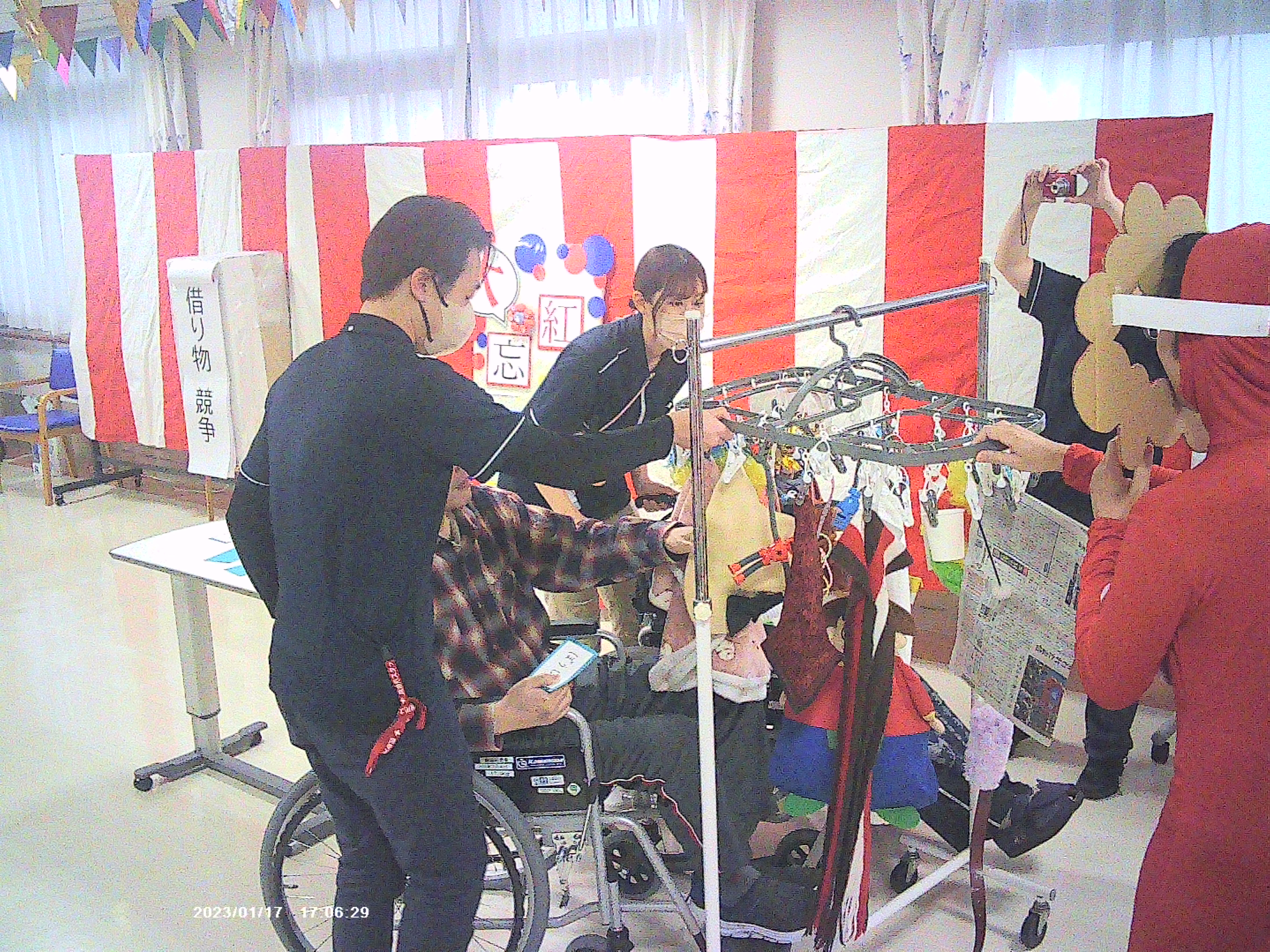 今回は、A・Bフロアーの紅白に分けて、新聞巻き競争・借りもの競争・アメ食い競争(スタッフのみ)・玉入れの4つの競技を行いました。